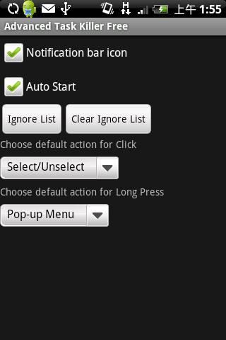 設定頁面中的第1個選項Notification bar icon是在提示列放上Advanced Task Killer的捷徑,例如畫面左上角的小綠人