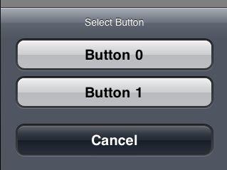 UIActionSheet *actionSheet = [[UIActionSheet alloc ] initWithTitle:@"SelectButton" delegate:self cancelButtonTitle:@"Cancel" destructiveButtonTitle:nil otherButtonTitles:@"Button 0", @"Button 1", nil];