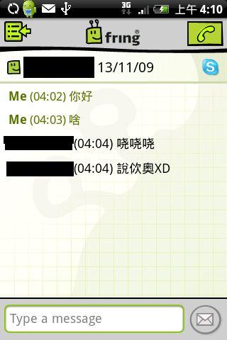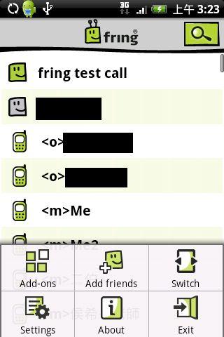fring是一套非常方便的通訊軟體,可以把各種聊天和語音協定整合在一起,且是目前Android上可以正常進行Skype和Skype Out通話的軟體,非常值得使用,雖然目前Beta版還有些小問題,但是相信到正式版會有所改善的,大家一起為fing加油~