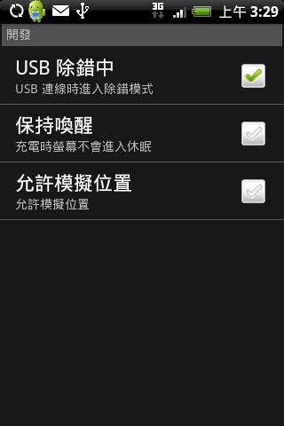 進入設定->應用程式->開發->USB 除錯中 打勾